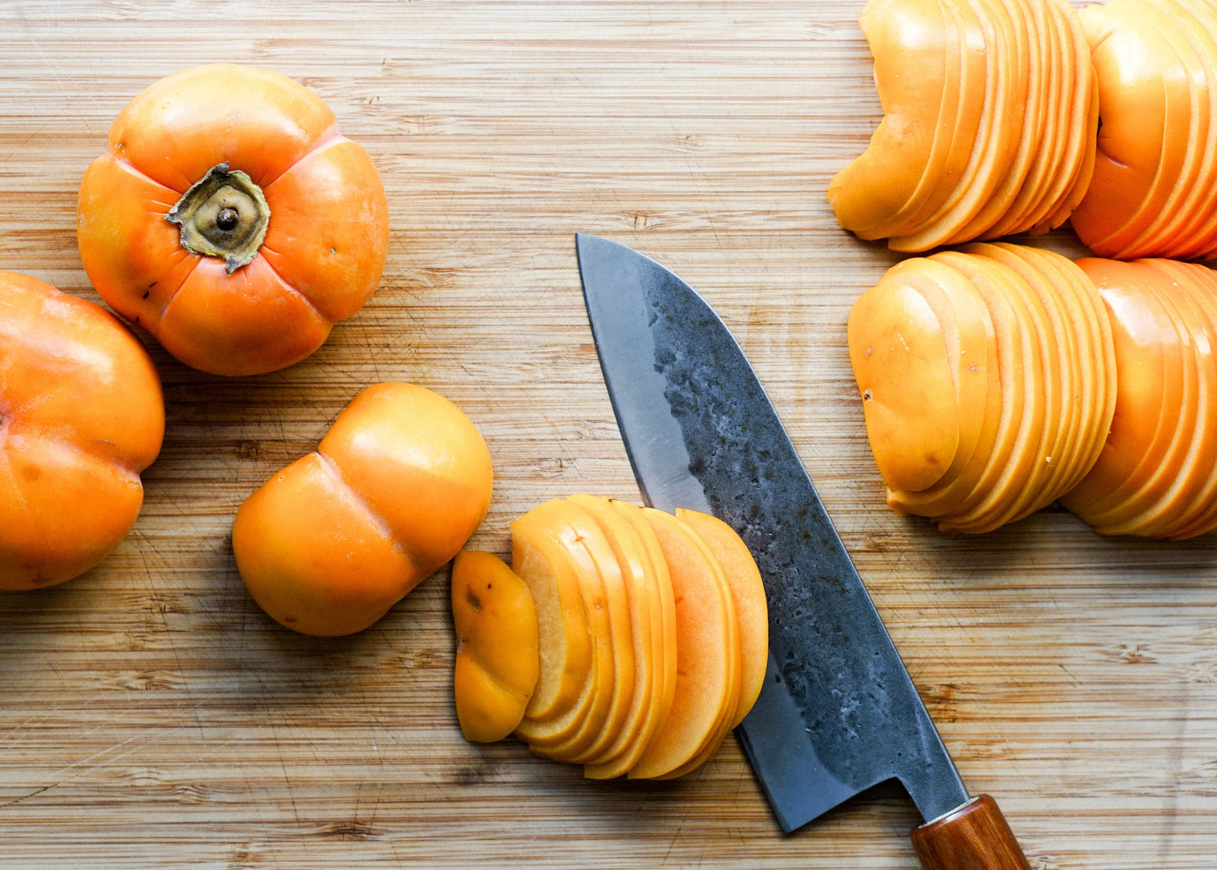 While the dough is chilling, prepare your persimmons. Remove the stem of the persimmons. Cut them in half. Then with the cut side flat against the cutting board, cut the persimmon in 1/8” thick slices. Try to keep the slices together for a neat arrangement. Repeat with remaining persimmons.