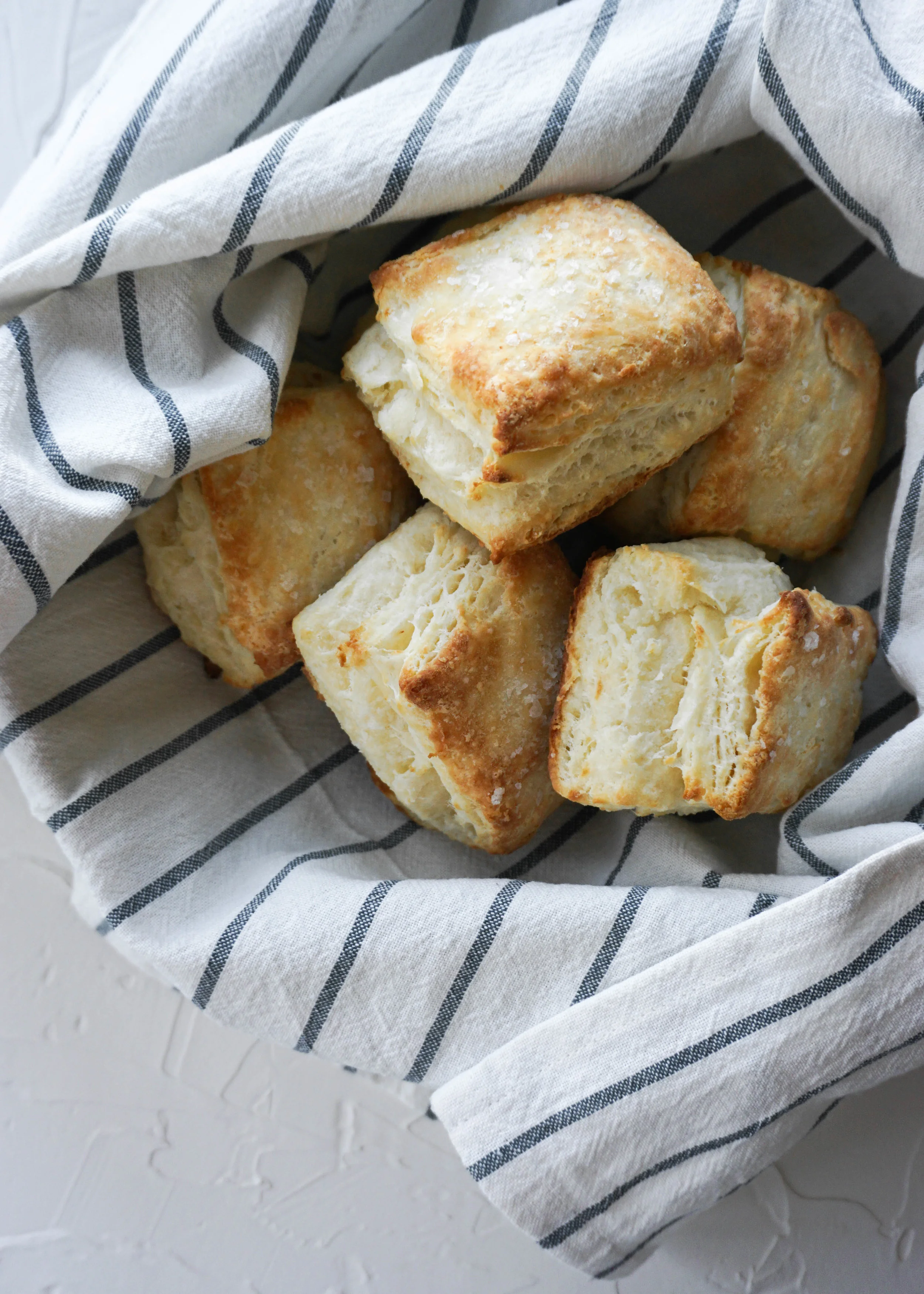 We'll I've figured out how to make great biscuits about a year ago in the form of Everything Bagel Biscuits. But I figured Eat Cho Food needed a classic biscuit recipe! I got really into making biscuits a little over two years ago when we were in Portland and ate at Pine State Biscuits. OMG they are so good. I immediately had to figure out how to achieve their level of deliciousness. I've researched many recipes and tested out a bunch of different techniques. You always read about how you want everything to be really cold and to avoid overworking the dough. True. But I've found that the dough can actually handle a good amount of working and still turn out pretty stellar. I feel like I have a controversial approach to biscuits. I like to roll out the dough and fold in my layers. It's sort of like laminating dough for croissants or puff pastry. It honestly works so well! The biscuits turn out super tall and flakey. You can pull them apart just like those Pillsbury Grand Biscuits of our childhood. When I was a kid I literally ate those things layer by layer. It tasted better that way, duh. But these are seriously so good! They are perfectly buttery and salty on their own, but turn into pure magic when drizzled with some honey or smeared with some jam. Please make a breakfast sandwich with them!