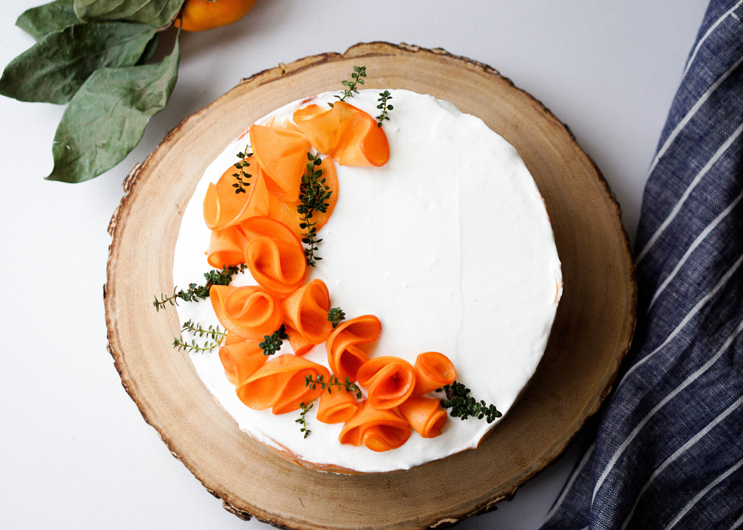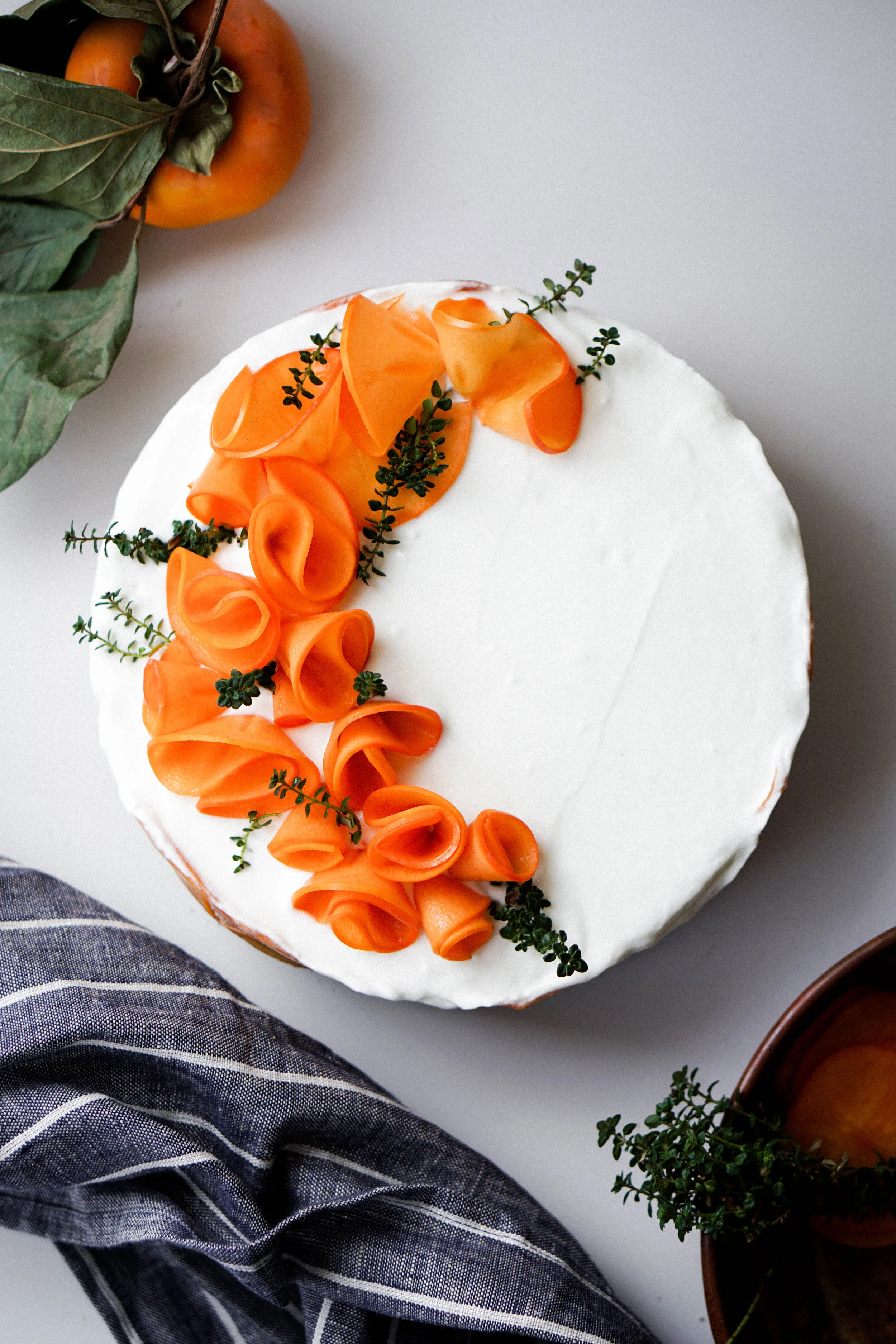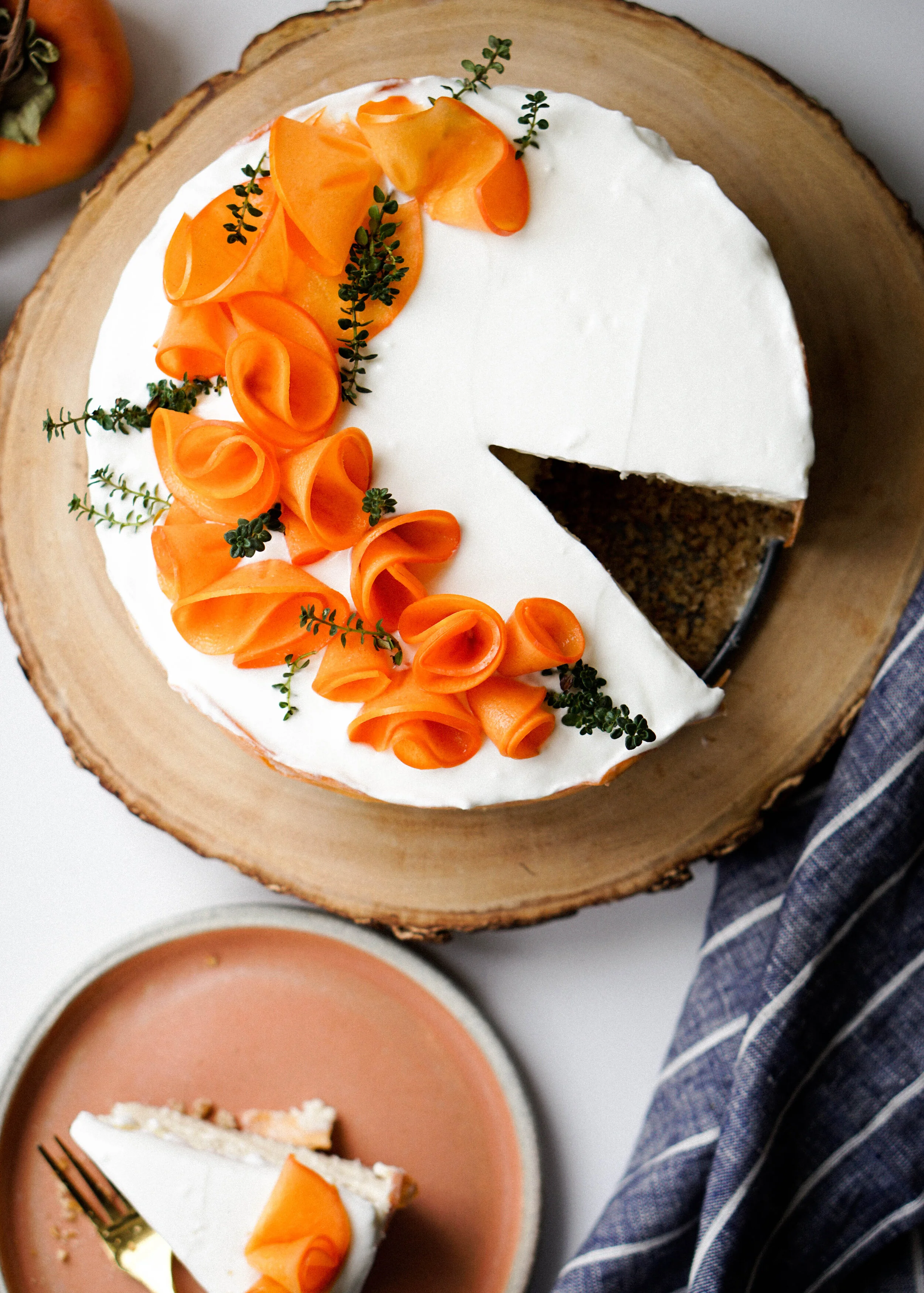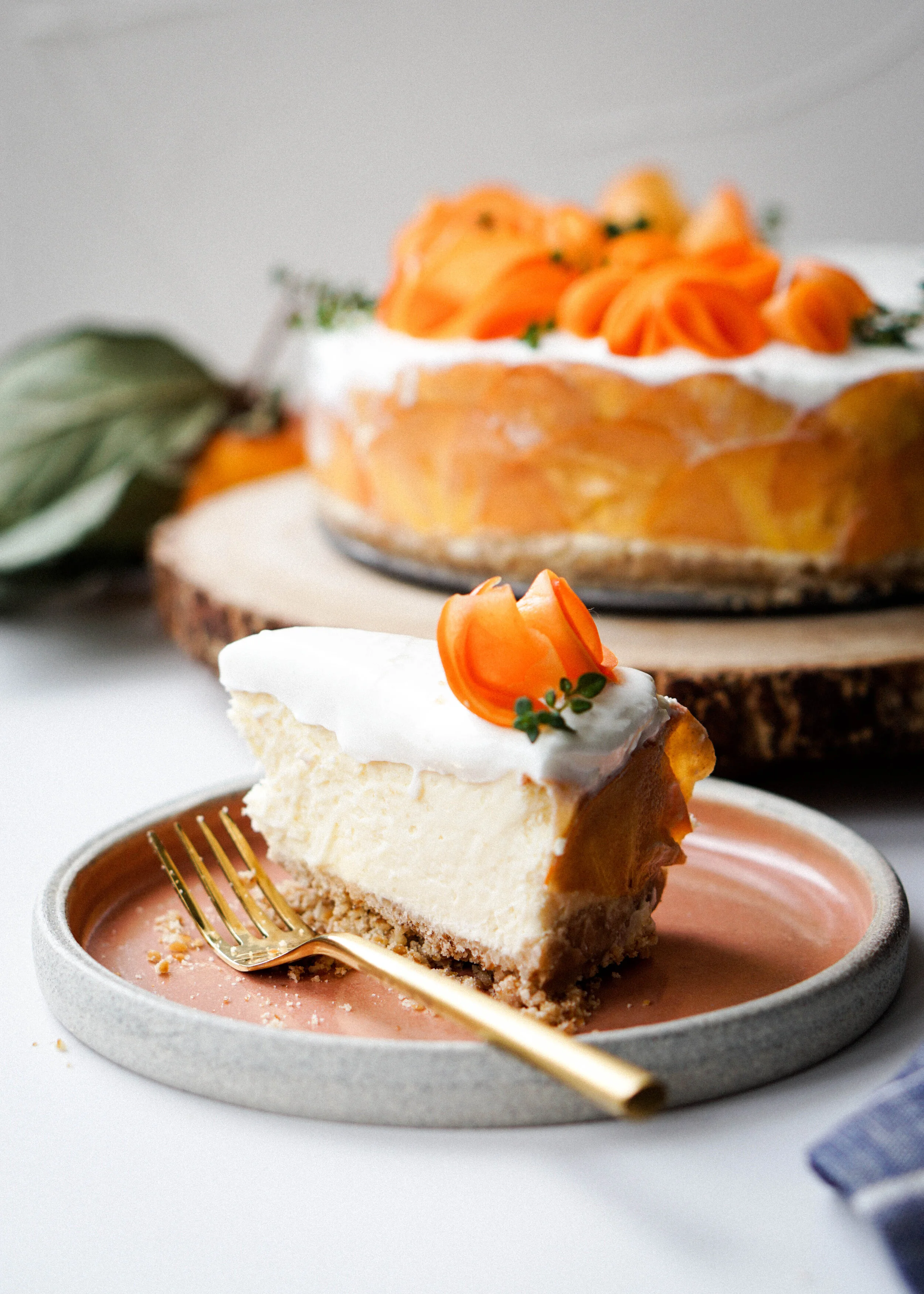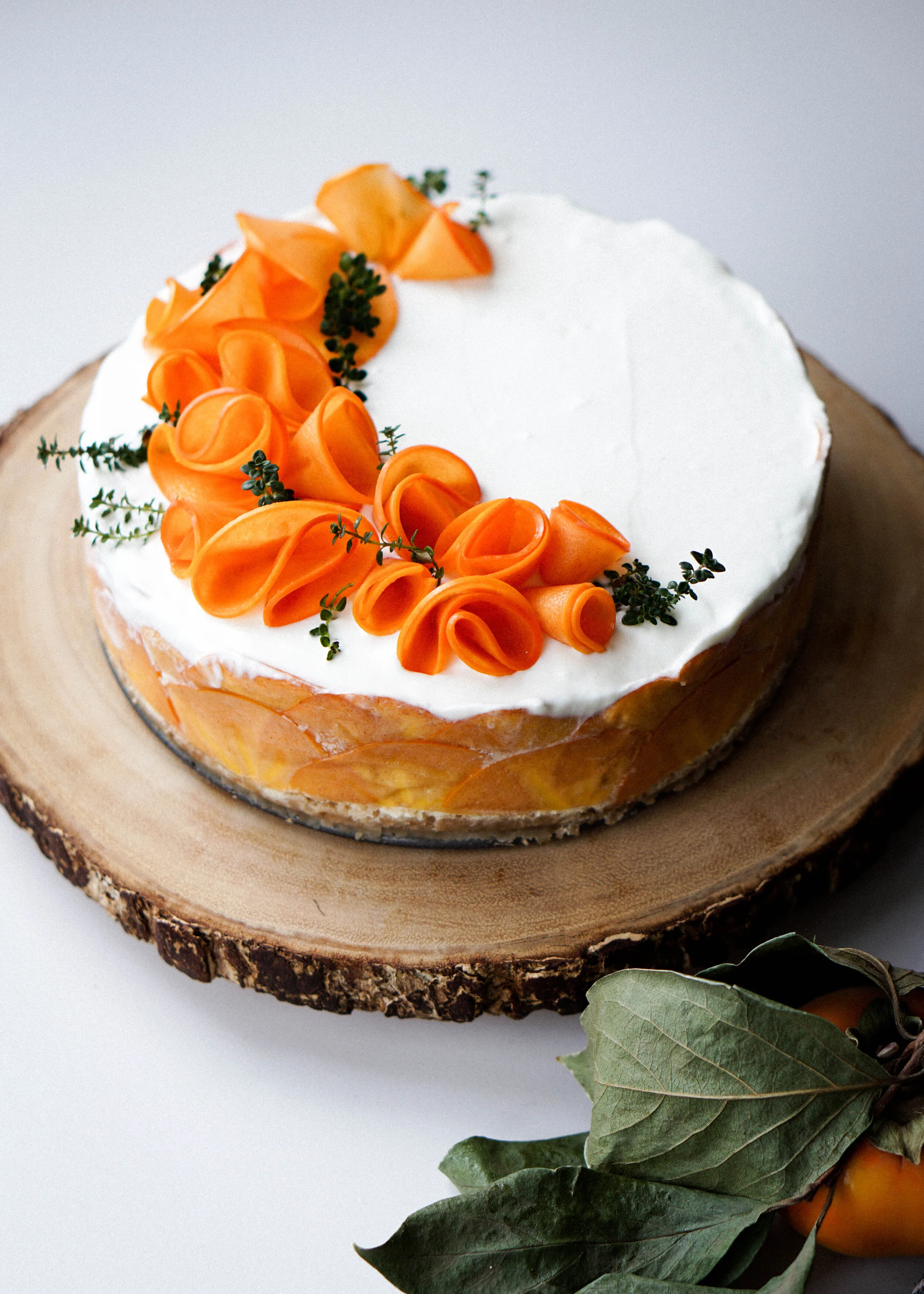 The addition of thinly sliced persimmons around the edges create a wax paper like effect. It’s so lovely! You can cut the persimmons using a very sharp knife or slice them on your mandoline - watch your fingers! The slices will naturally stick to the sides of the spring form pan. Roll up the remaining slices of persimmon to top your cheesecake. The gently folds and turns of the thinly sliced persimmons look almost like rosettes but without a whole lot of effort. That’s the type of decoration style I’m aaaallllll about these days! It gives you more time to work on your cookie tins and overly ambitious gingerbread house : )