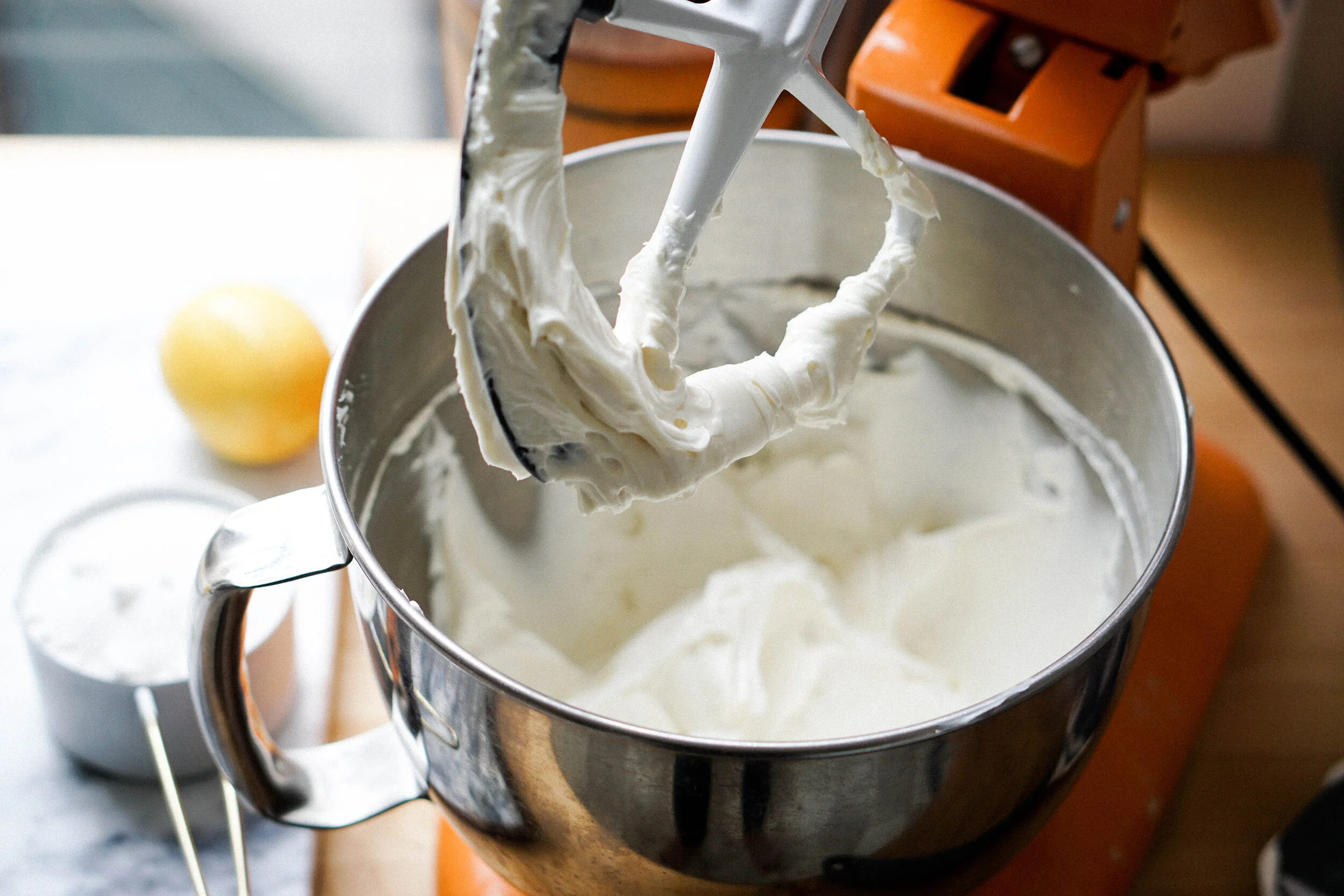To make the cheesecake filling, place softened cream cheese in the bowl of standmixer fitted with the paddle attachment. Beat on medium speed for 4 minutes, until light and smooth. Add sugar and salt and beat for another 4 minutes. Scrape down the sides every 2 minutes. Add the vanilla, lemon juice, lemon zest and mix for 30 seconds. While mixing on low, add 1 egg, making sure to thoroughly mix between additions and scraping down the sides. Add the creme fraiche or yogurt and mix on low for another minute until the cheesecake filling is smooth and creamy.