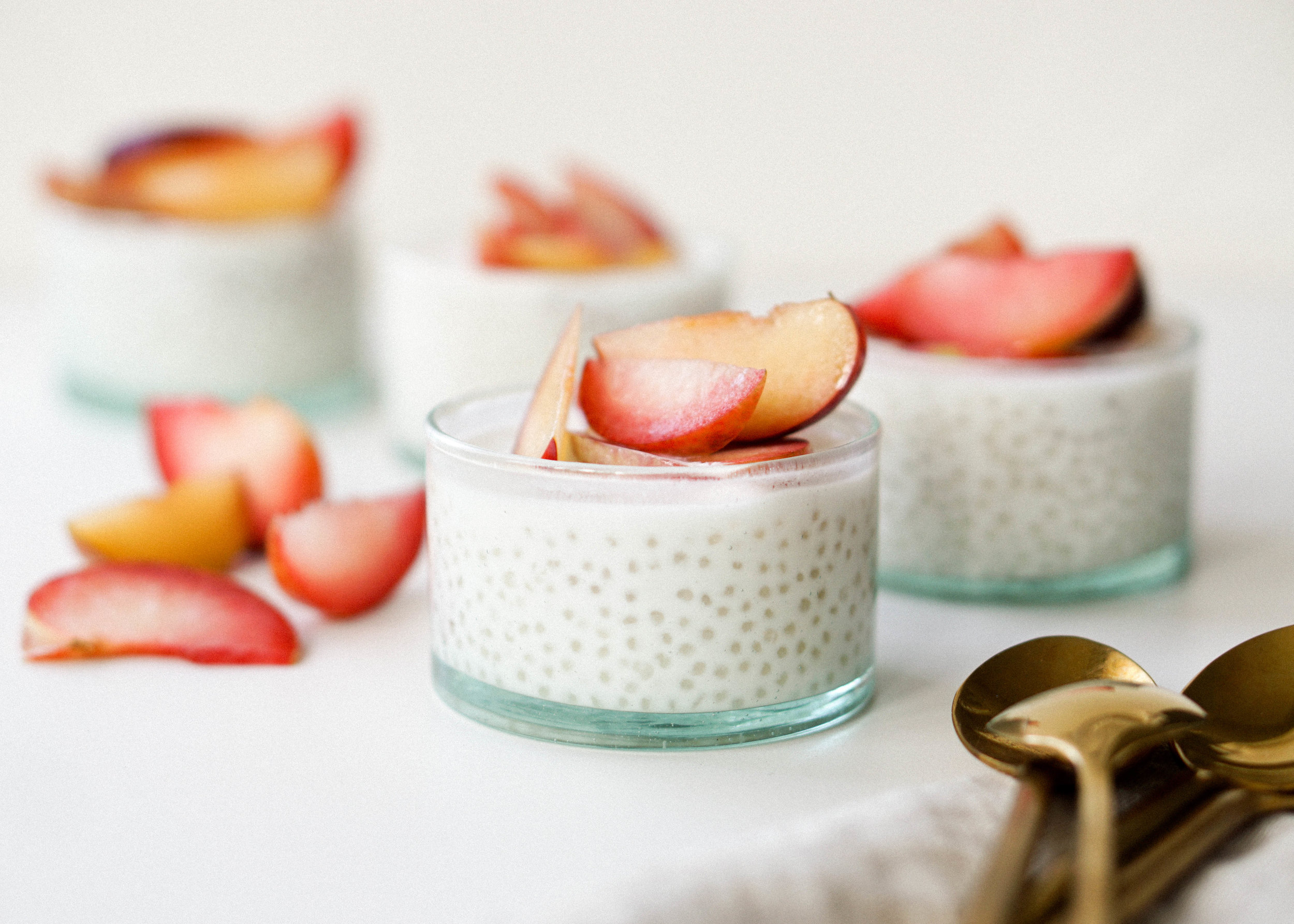 Portion the coconut sago into small bowls. Top with sliced pluots and enjoy!