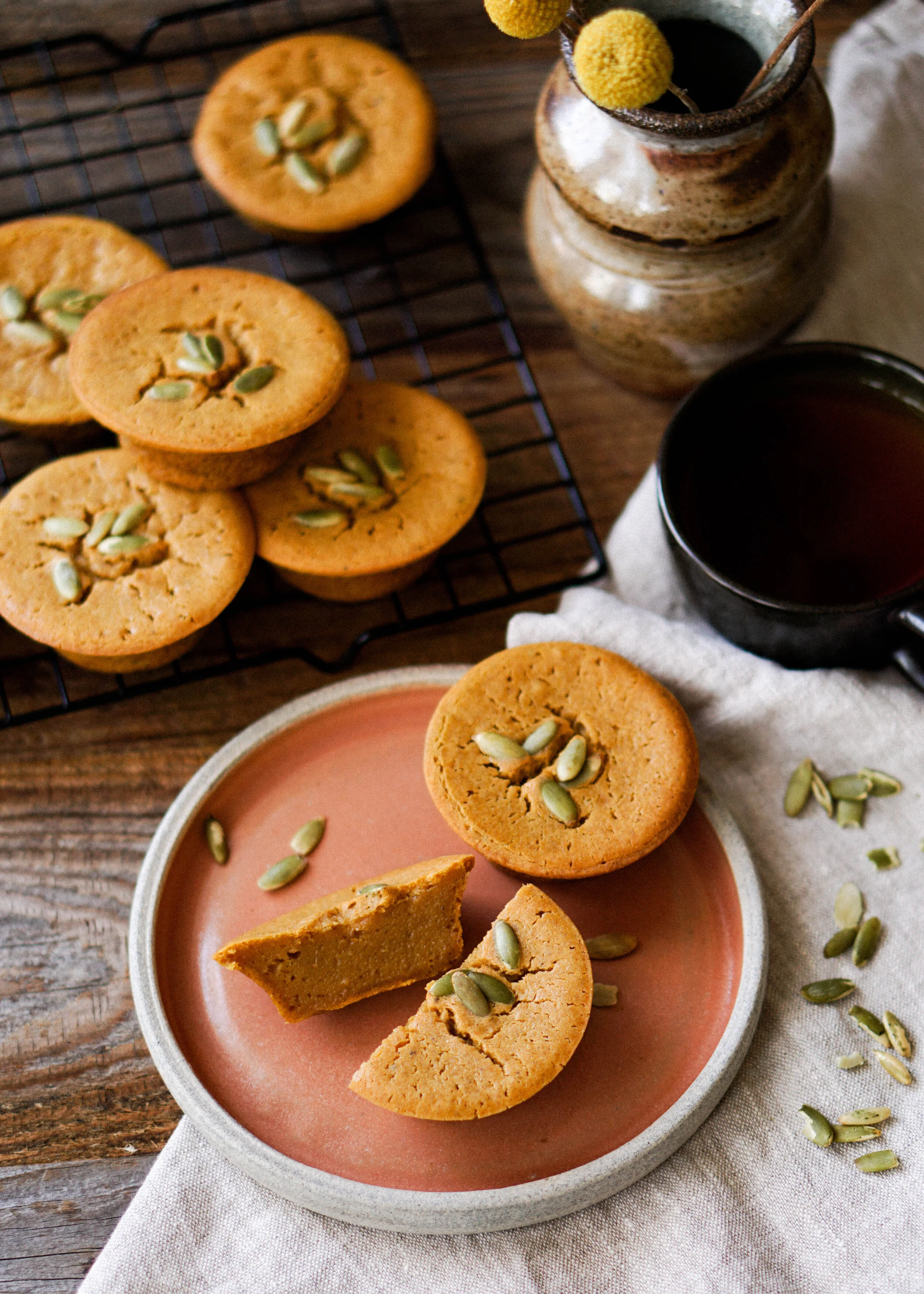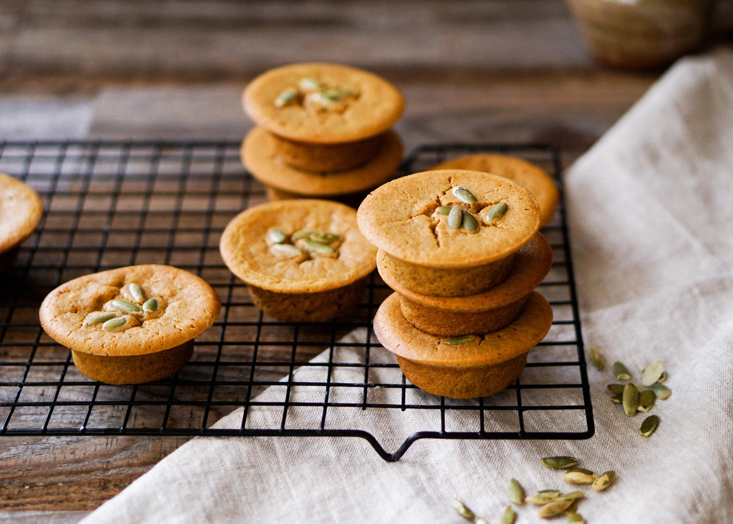 4. Fill muffin tins with mochi batter up to just below the rim. Top muffins with some pumpkin seeds. Place in the oven and bake for 38-42 minutes.
