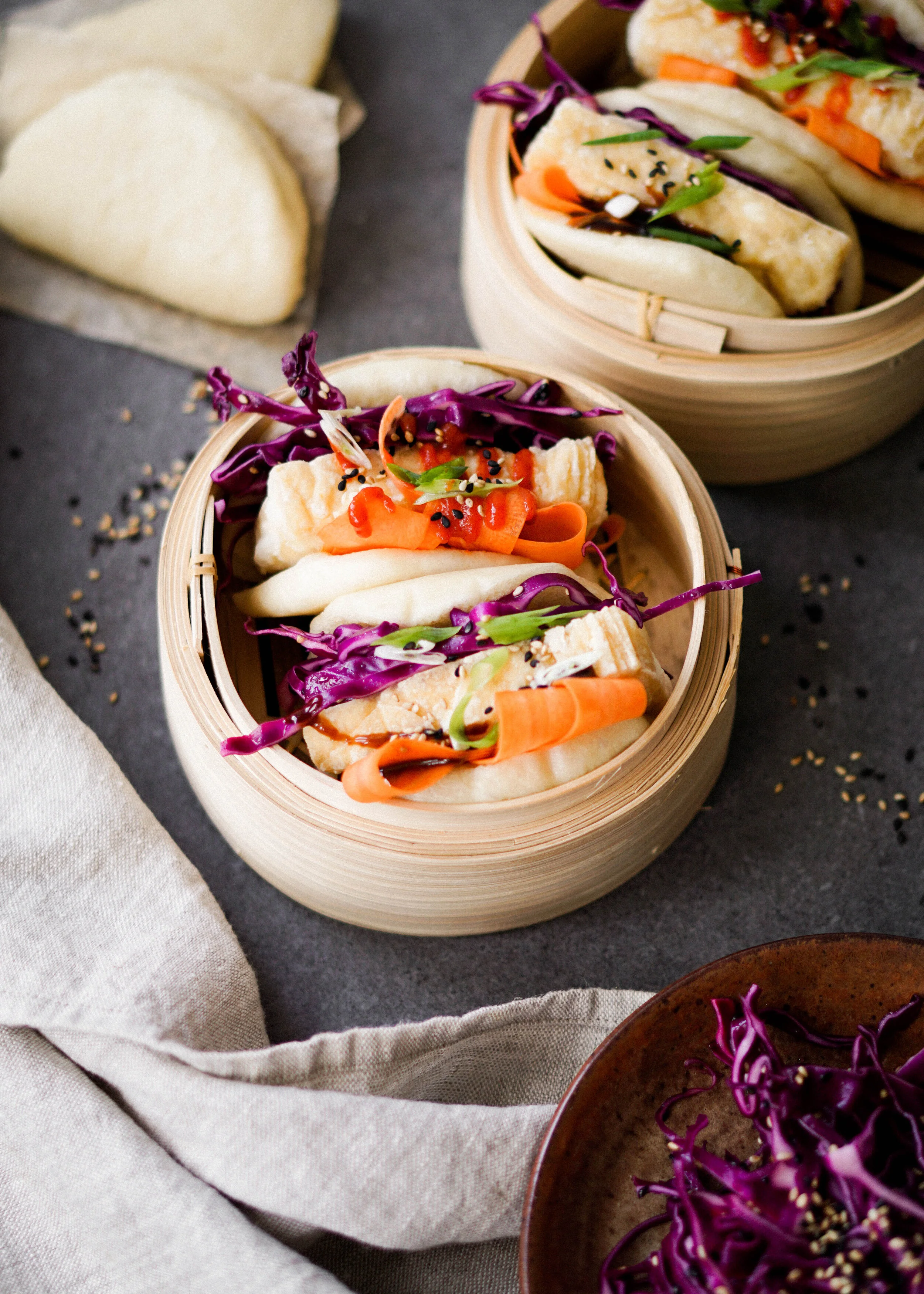 The crispy coating of the tofu (thanks to a blend of rice flour and cornstarch) is a delightful foil to the soft fluffy steamed bun. Adding a little bundle of tangy cabbage slaw and thinly sliced carrots take the texture level up a notch while also adding some much needed acidity and brightness! I also like to squirt some hoisin and Sriracha on these bad boys for a little extra flava!