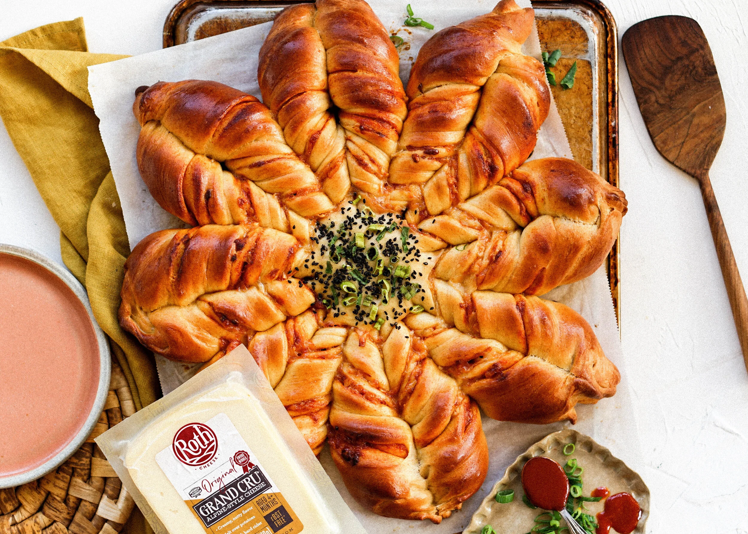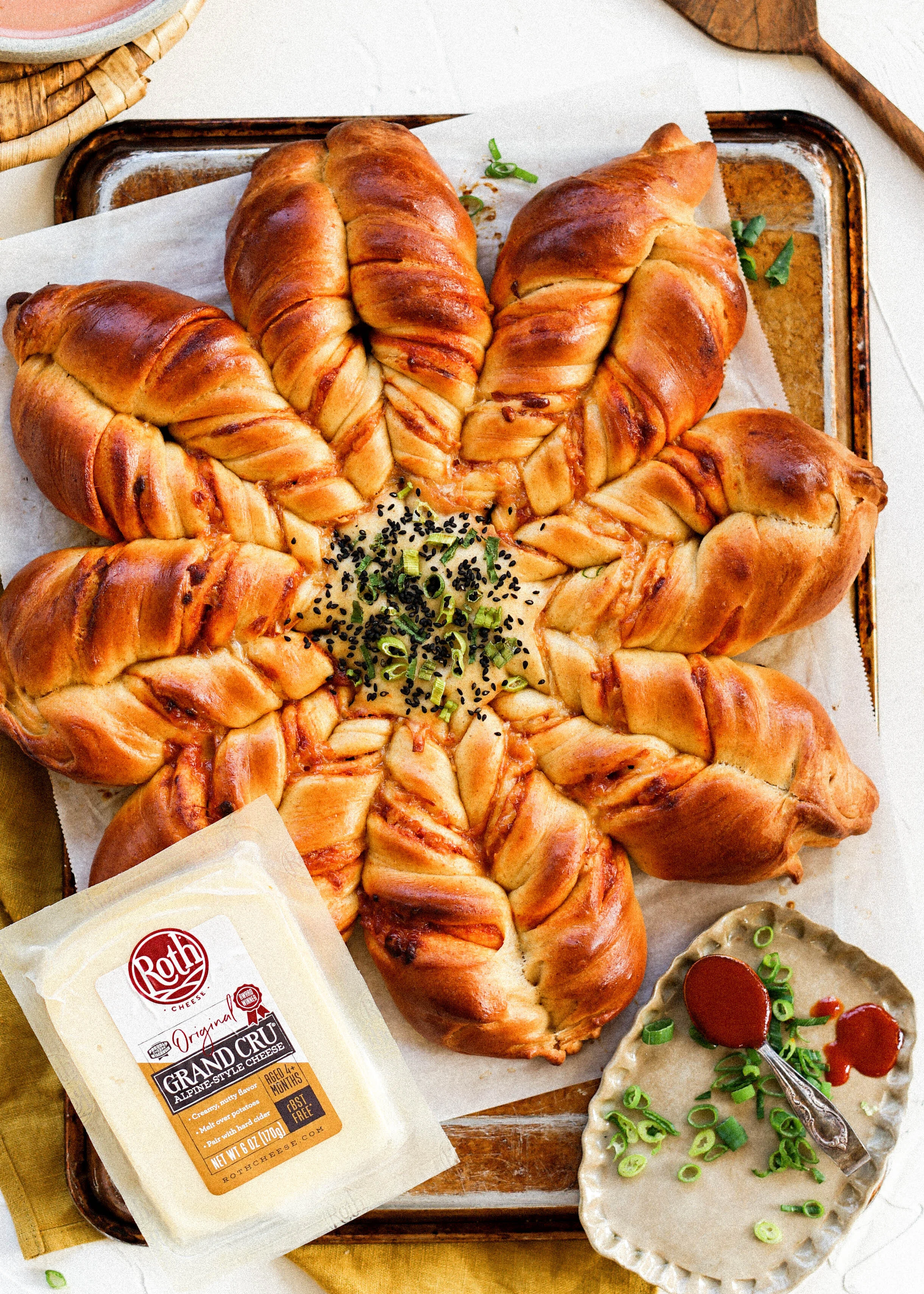 For this star bread, I made a sauce with gochujang, hoisin, honey, water, and a little sesame oil. I literally could have drank the sauce out of the cup. It would be delicious tossed with crispy tofu or roasted vegetables. I also think it would make an excellent glaze for chicken or salmon - the honey will caramelize beautifully! To compliment the sauce, I used Roth Grand Cru cheese! Grand Cru is new to me, but has quickly become one of my favorite cheeses! It’s an alpine-style cheese, mild in flavor with rich nuttiness, and melts sooooo beautifully! If you’re looking for serious cheese pulls, THIS IS THE CHEESE. You can find it at most major grocery stores! Find the closest store!