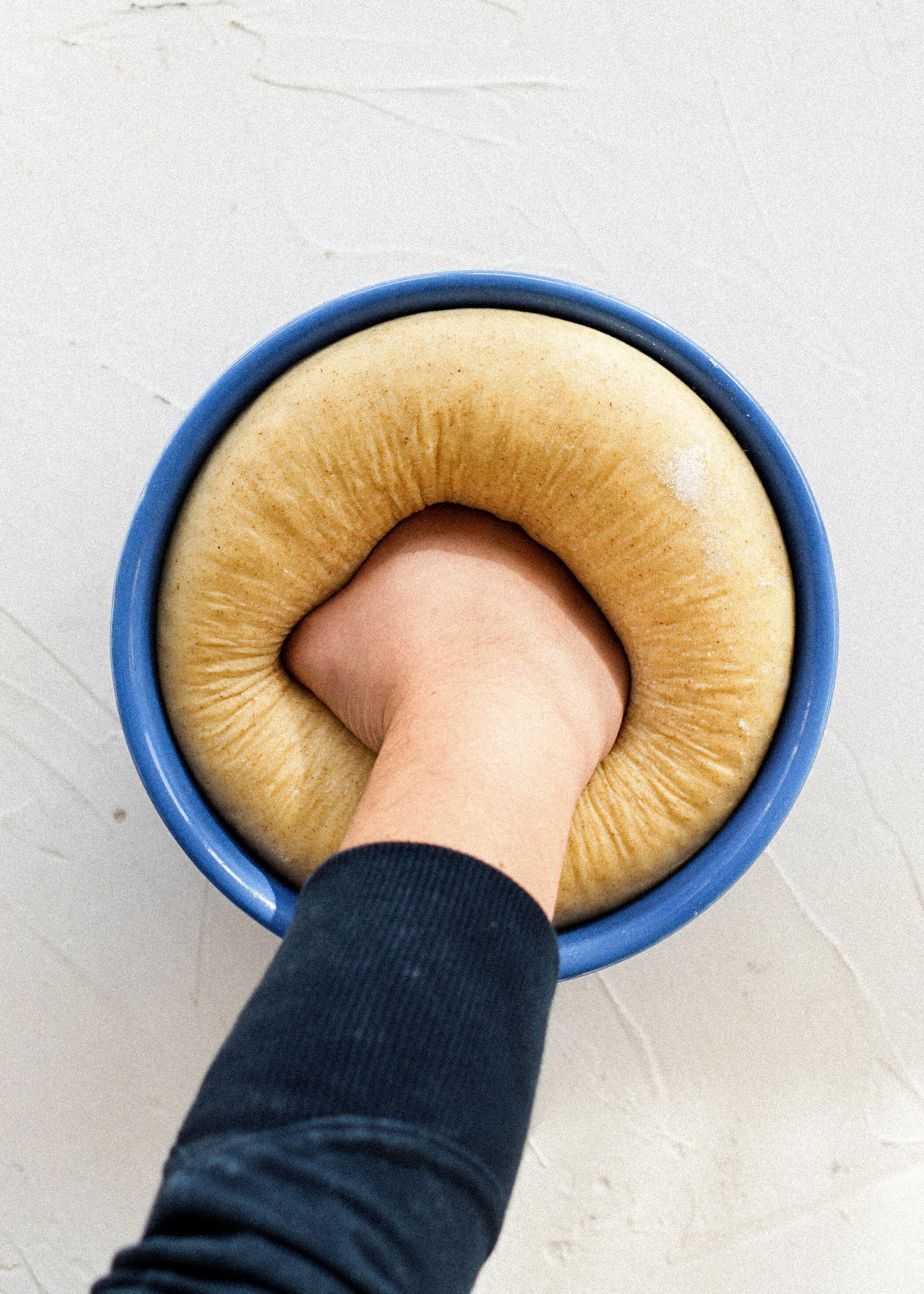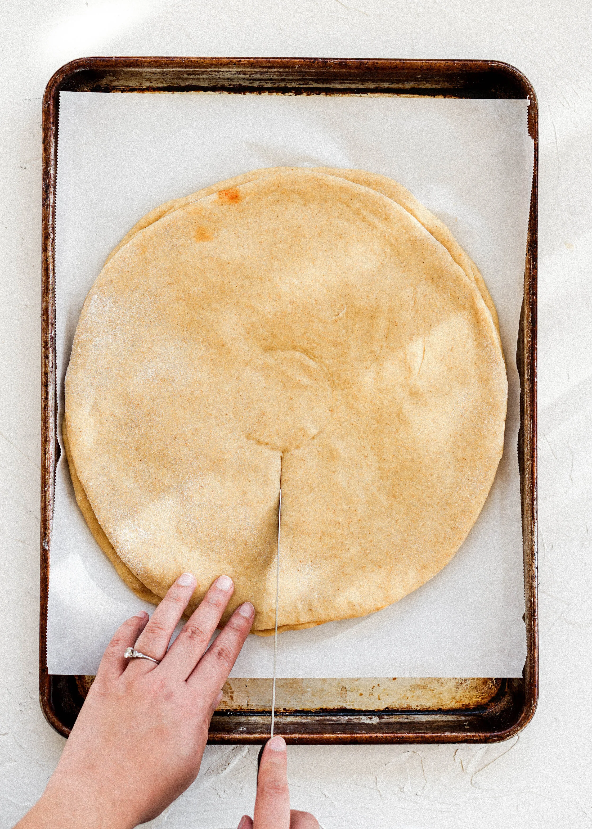 After the first proof, divide the dough into 3 equal portions. Roll out each piece into a 10” to 12” round.