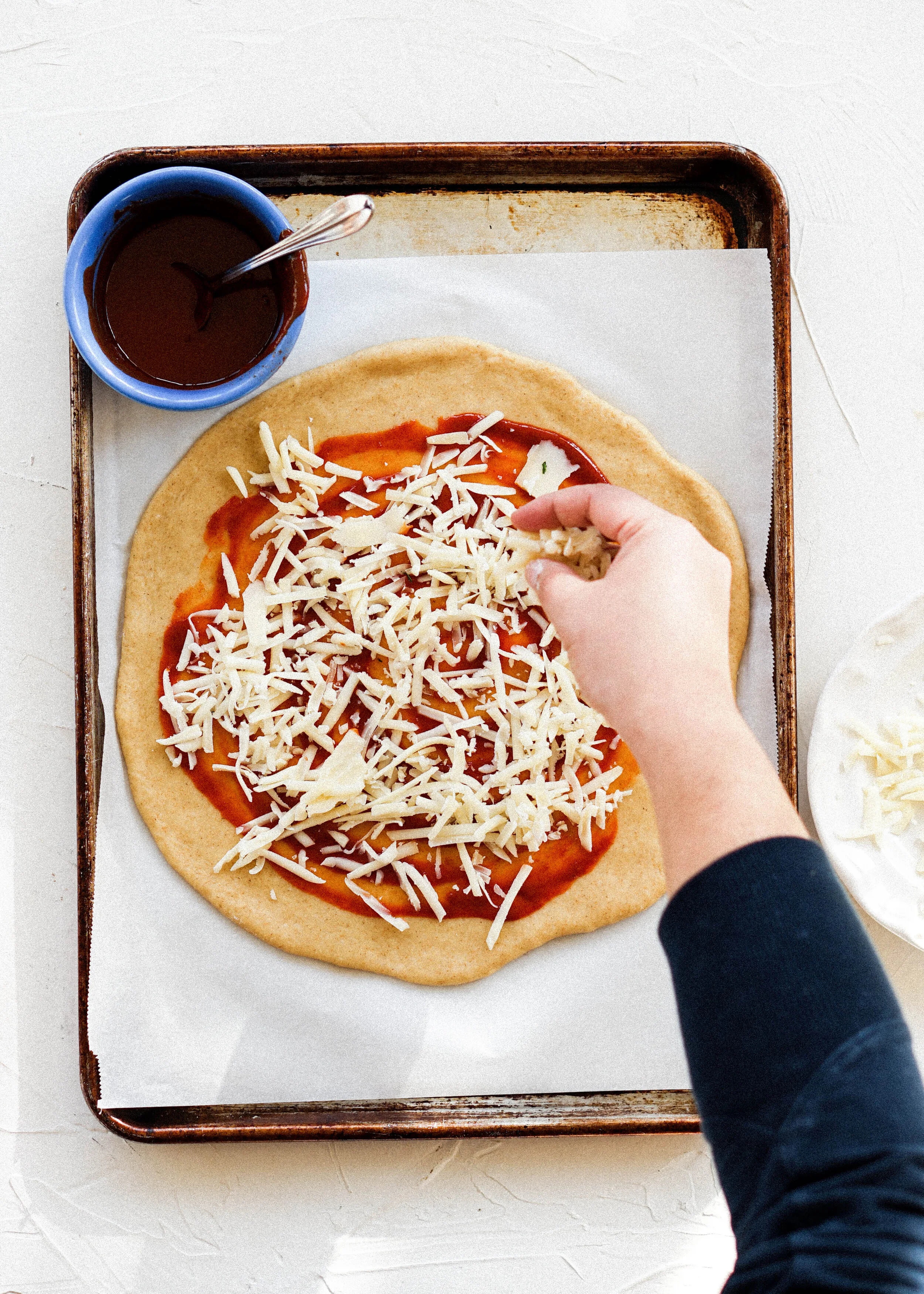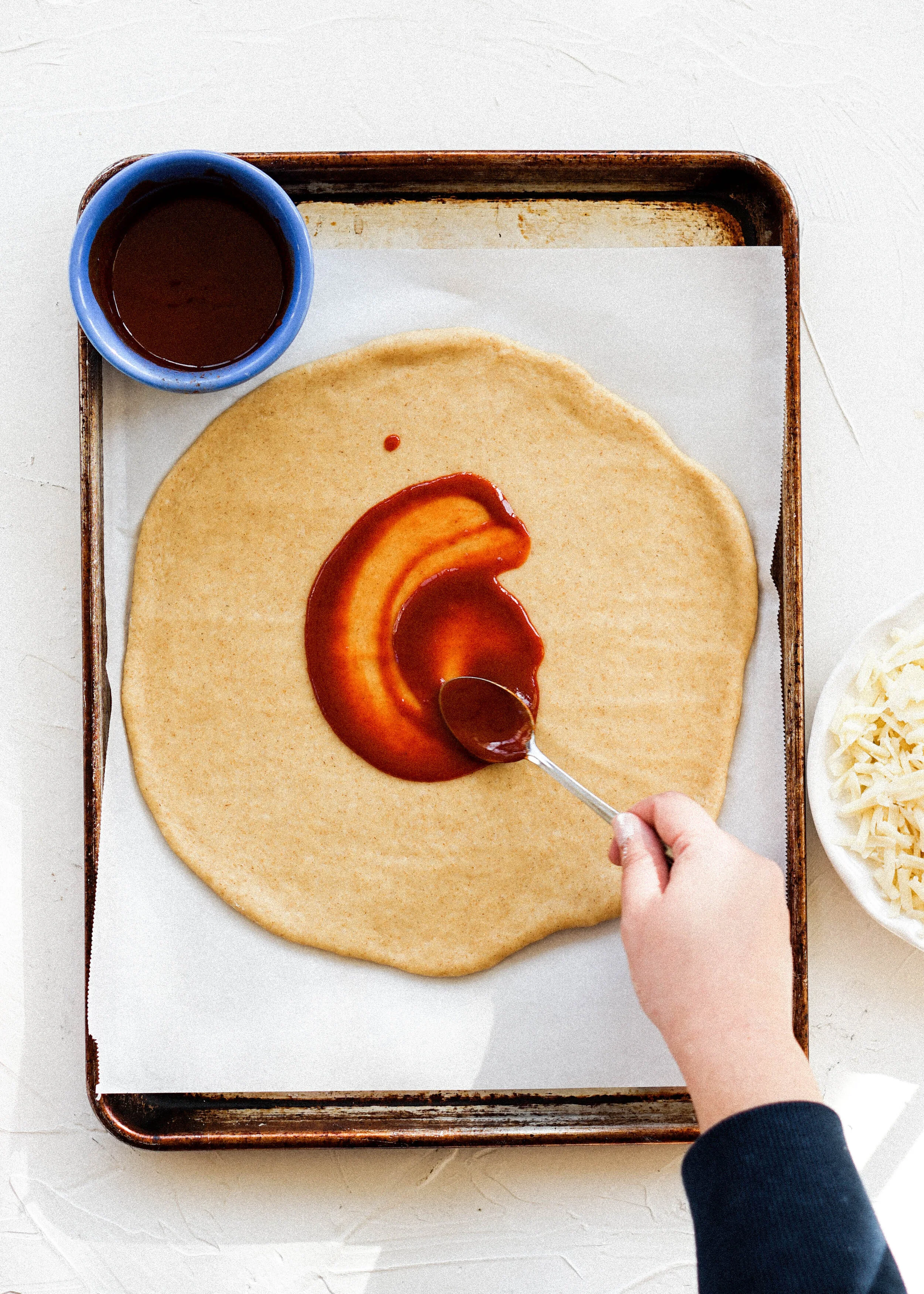 Place one round on a baking sheet lined with parchment paper. Spread half of the sauce over the dough and top with half of the shredded cheese.