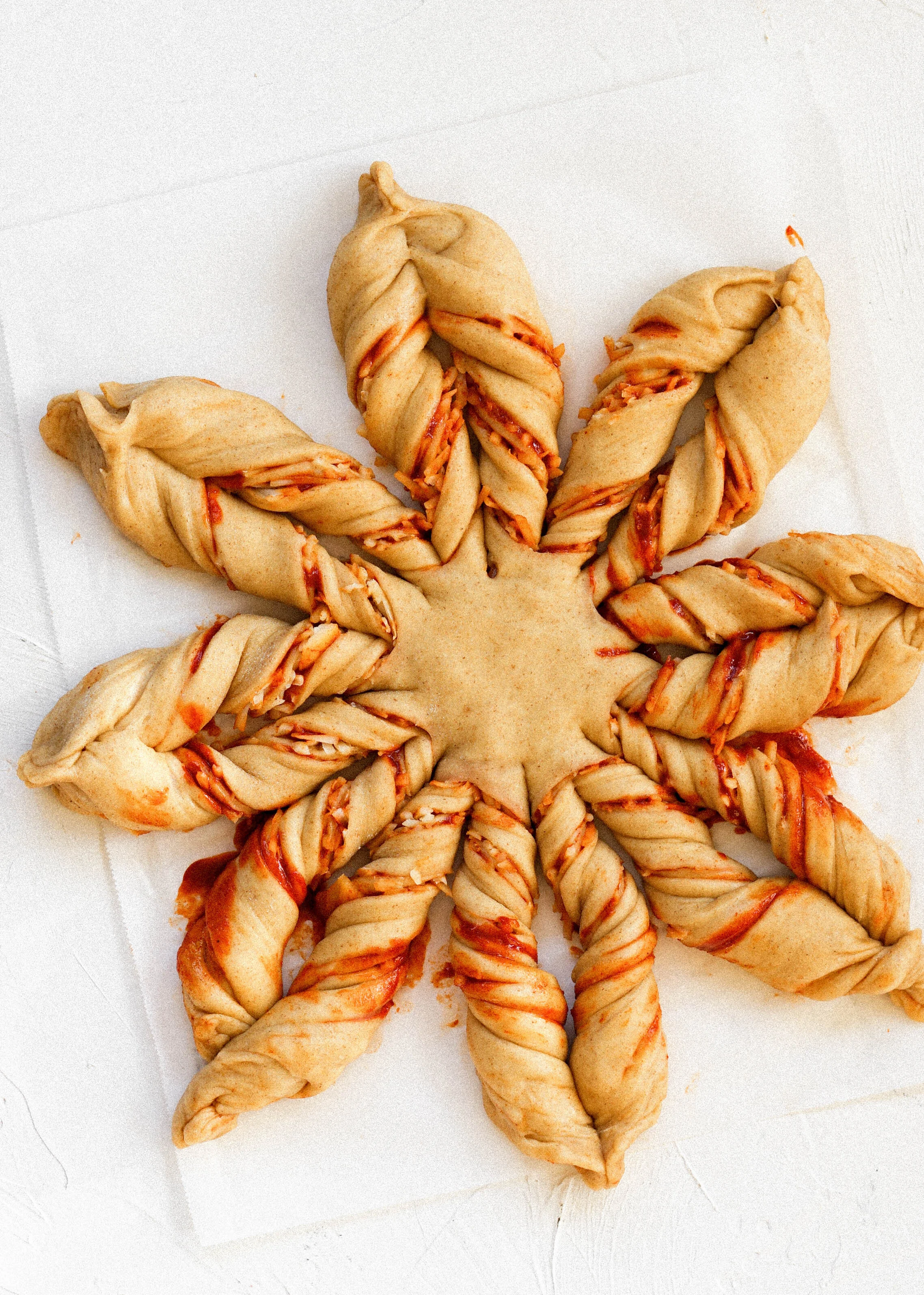 The three main components for the star bread are: dough, cheese, and sauce. Obvious, I know. The photos make it look like you’re assembling giant Lunchables, and honestly… it’s just about that easy to form a star bread.