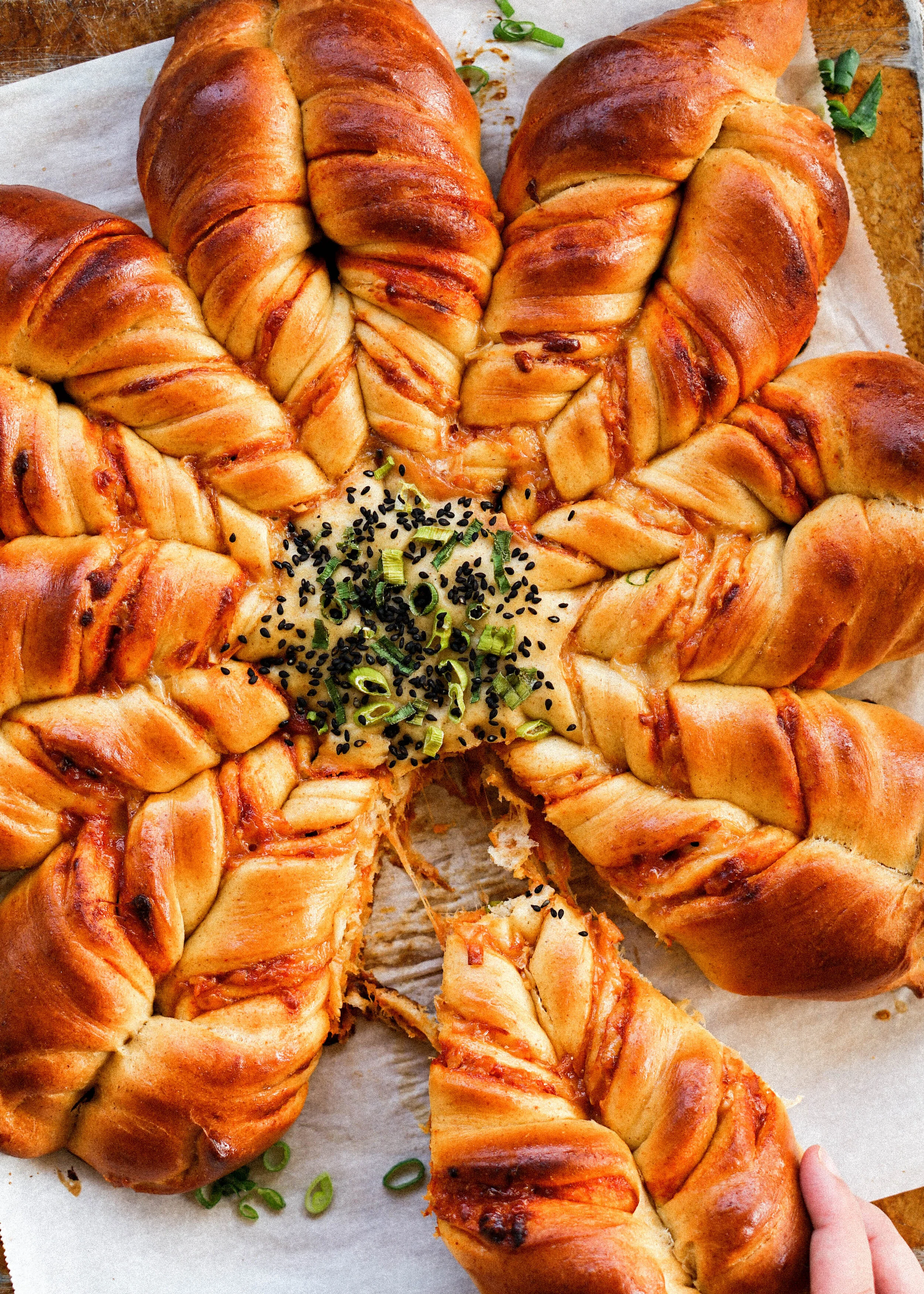 I’ve always wanted to make a star bread because it looks so fun and festive to make! I think it’s nice to have a little break from all the sweet cookies and cakes, so a savory bread ladened with cheese and ample spice sounded extra good to me! This Cheesy Gochujang Star Bread will be the star of your holiday and most likely won’t last very long!